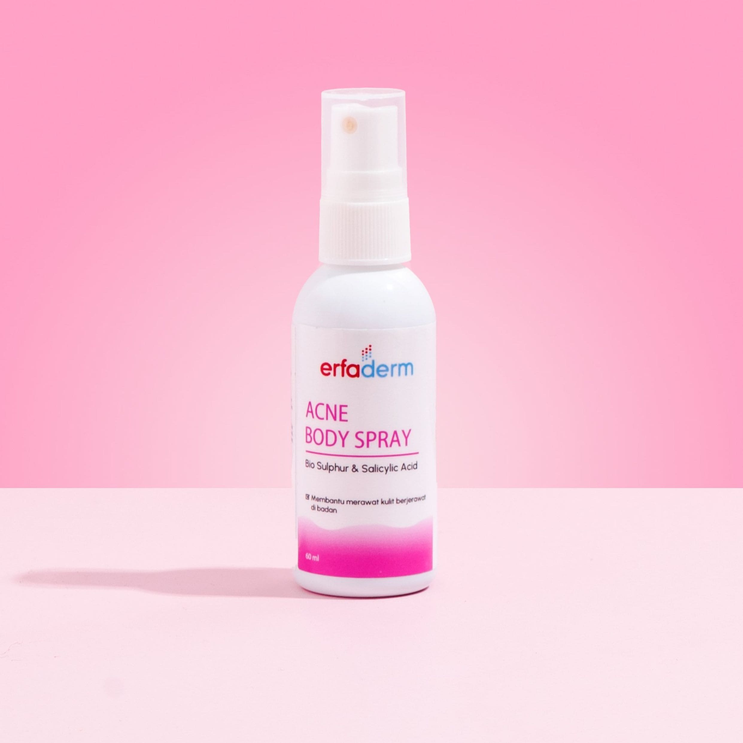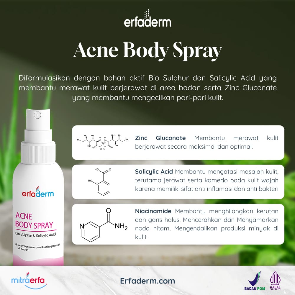 Erfaderm Acne Body Spray adalah produk yang dirancang secara khusus untuk merawat kulit berjerawat pada area tubuh, terutama punggung. Berikut adalah beberapa informasi mengenai bahan-bahan yang terdapat dalam Erfaderm Acne Body Spray: