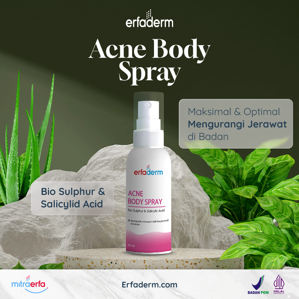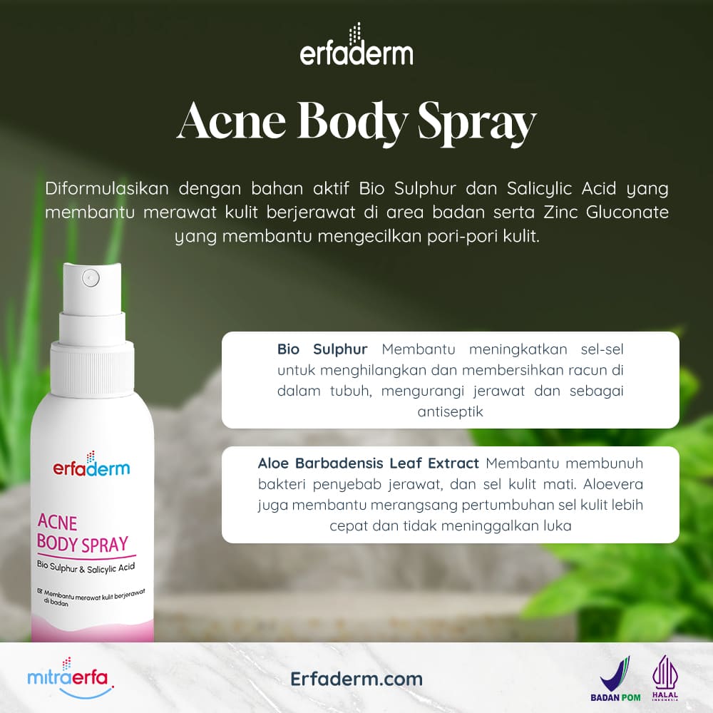 Erfaderm Acne Body Spray adalah produk yang dirancang secara khusus untuk merawat kulit berjerawat pada area tubuh, terutama punggung. Berikut adalah beberapa informasi mengenai bahan-bahan yang terdapat dalam Erfaderm Acne Body Spray: