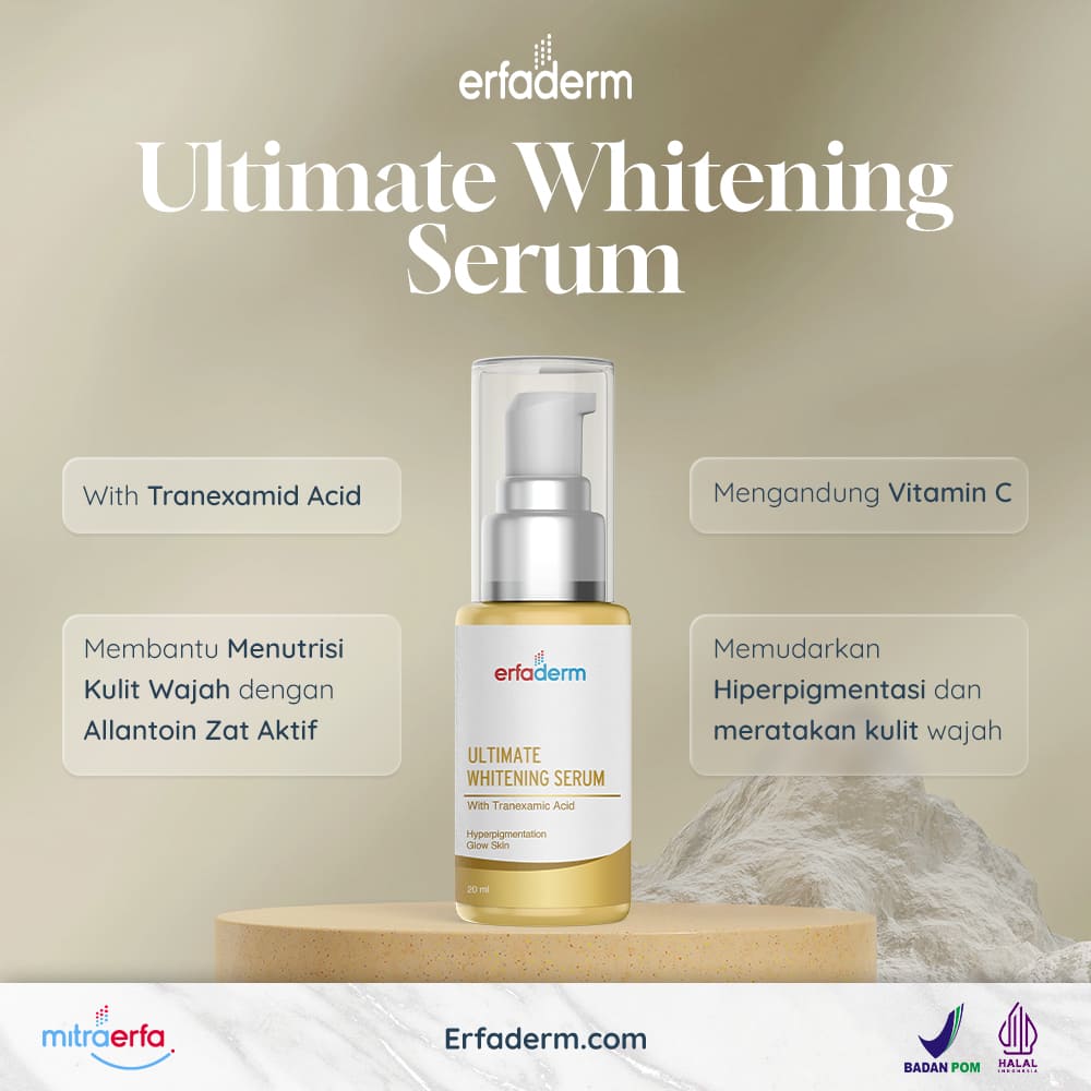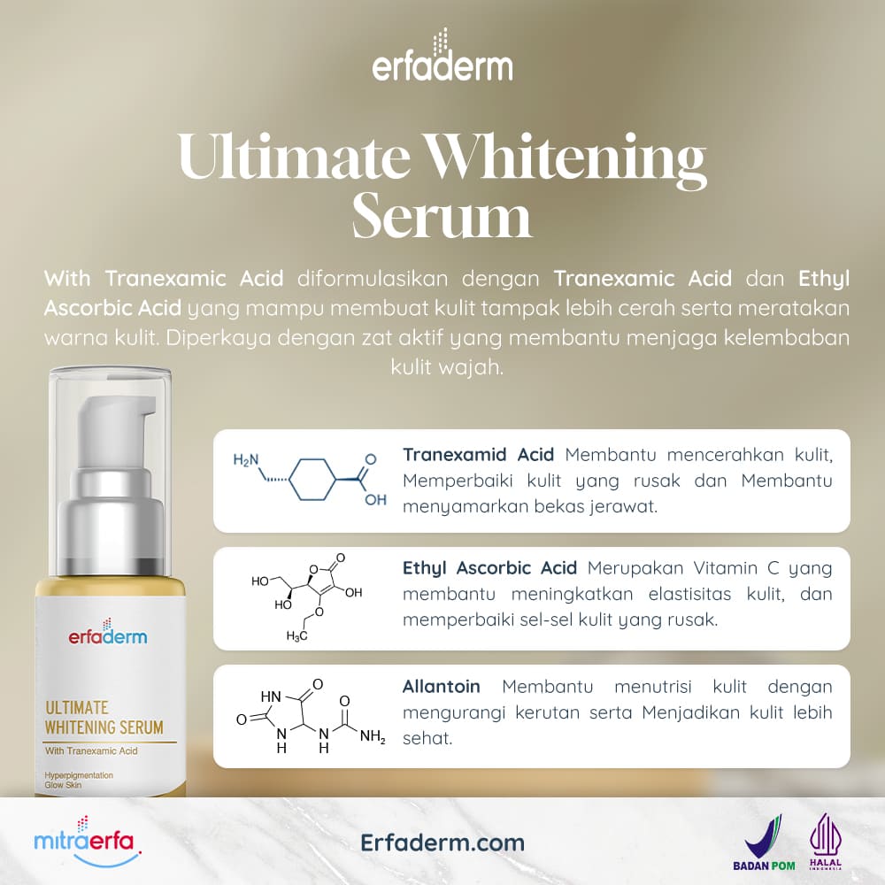 Dengan kombinasi bahan-bahan ini, Erfaderm Ultimate Whitening Serum membantu kulit wajah anda tampak lebih cerah, meratakan warna kulit, dan menjaga kelembaban kulit wajah. Penting untuk mengikuti petunjuk penggunaan yang disarankan dan memberikan waktu yang cukup untuk serum bekerja pada kulit agar mendapatkan manfaat maksimal.